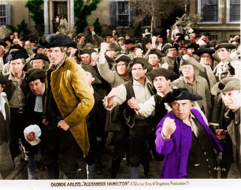 Somehow the caption, “Hamilton is the hero of the people,” doesn’t quite work with this photo. But with George Arliss in the the title role, find out how he turns those jeers into cheers. Film buffs will recognize veteran character actor Russell Simpson on the far left playing an old Revolutionary War veteran. To his right most prominently tall is Charles Middleton, a well-known supporting actor usually cast as villains (e.g., Emperor Ming the Merciless in Flash Gordon serials). Curiously, the cast log for HAMILTON lists Middleton as playing John Jay, the first Chief Justice of the U.S. Supreme Court, but this character never appears in the finished film and all we have of Mr. M is this uncredited bit (he’ll never get to the Supreme Court this way!):