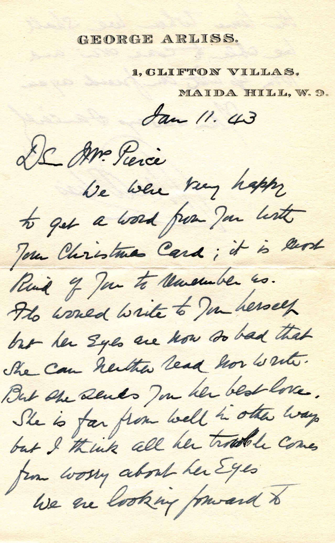 “Dear Mrs. Pierce, We were very happy to get a word from you with your Christmas card; it is most kind of you to remember us. Flo would write to you herself but her Eyes are now so bad that she can neither read nor write. But she sends you her best love. She is far from well in other ways but I think all her trouble comes from worry about her Eyes. We are looking forward to…”