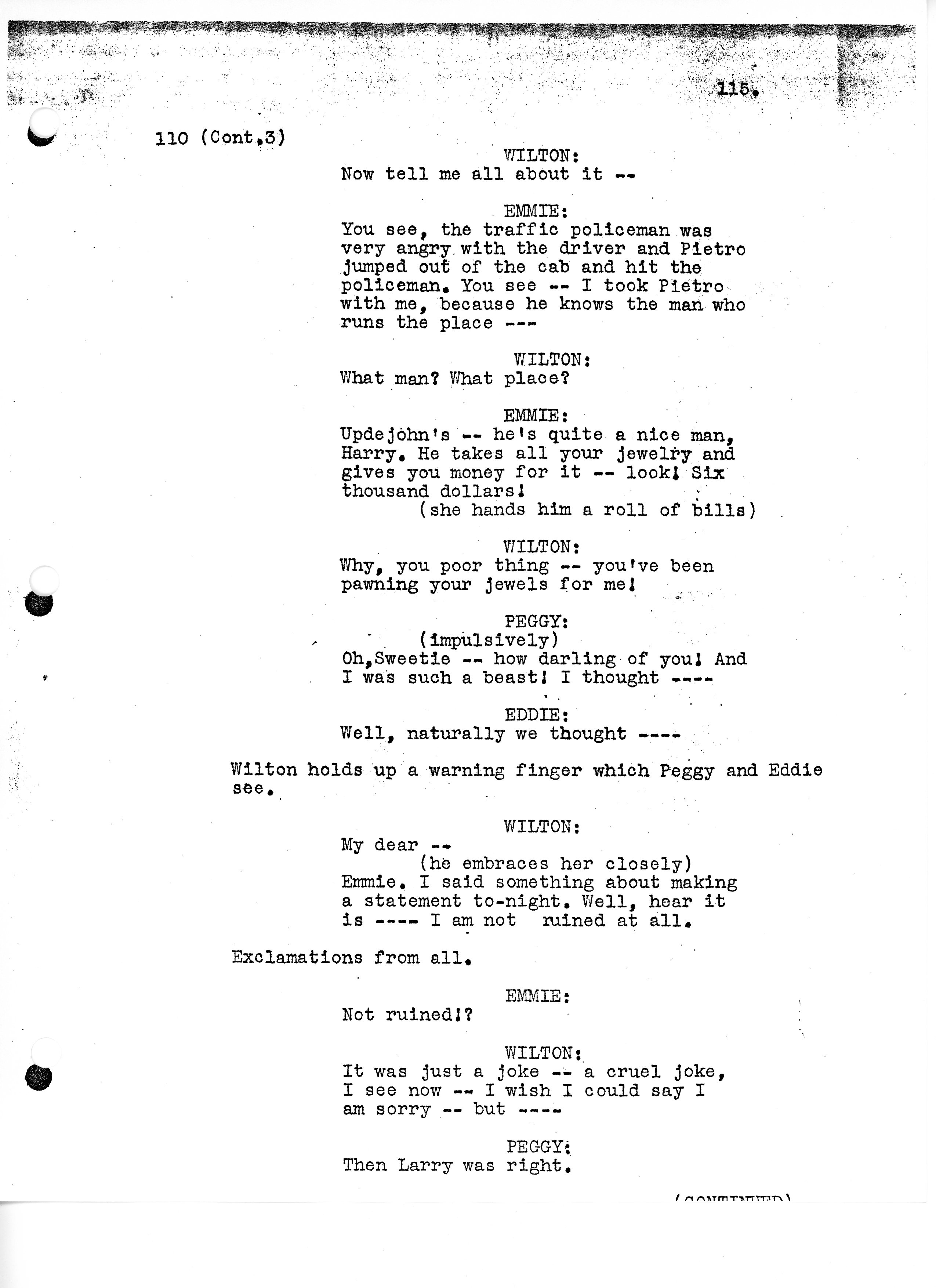 Before Wilton can tell Emmie the next day that he is not ruined after all, he learns that she has packed up all her jewelry and left in a taxi with her protege Pietro. Fearing the worst, Wilton tells Larry, Peggy and Eddie that Emmie left because she was afraid to be poor: