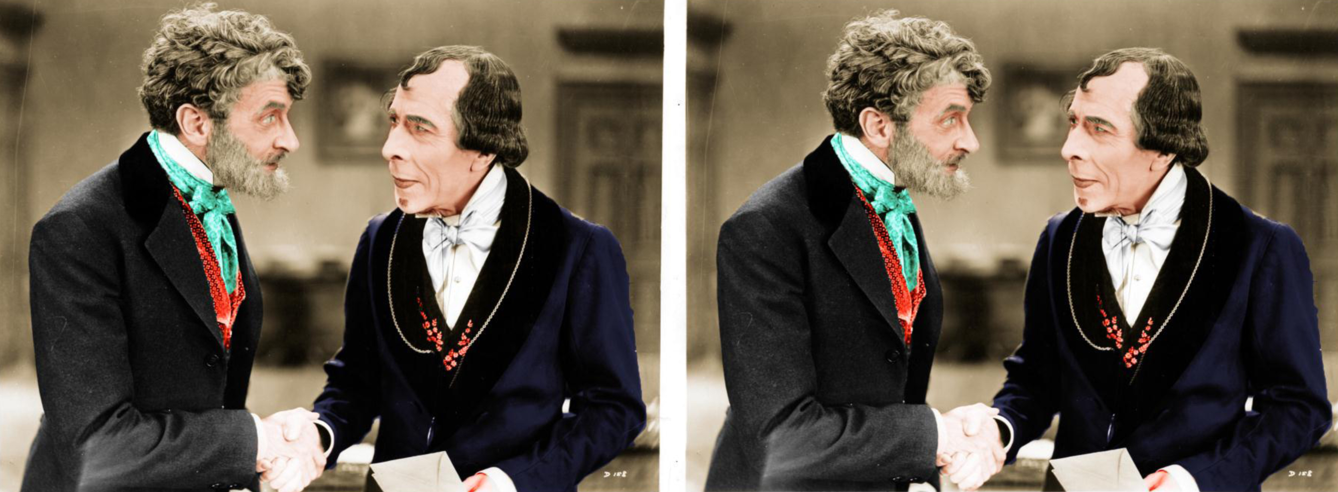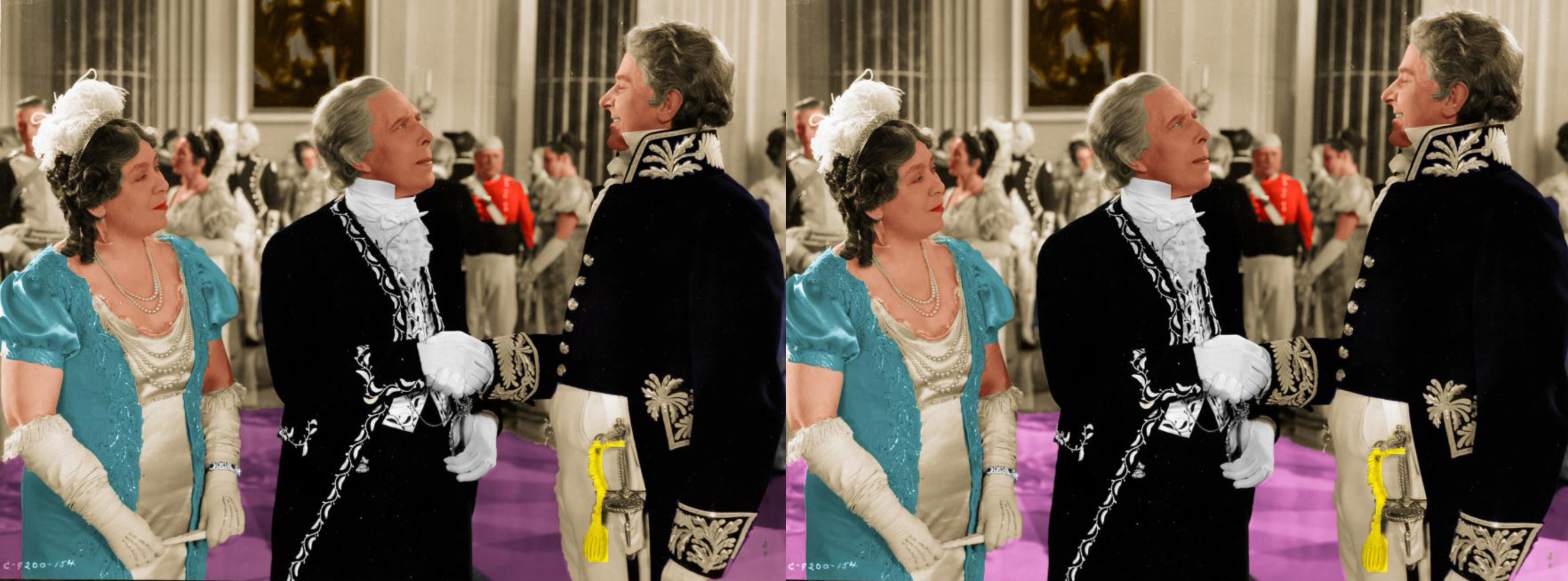 This photo is from the closing scene of THE HOUSE OF ROTHSCHILD that was originally photographed in color so I took my coloring cues directly from the film itself. I slightly altered the color of the carpet between the two images so you may notice a vivid quality as the colors combine. Florence Arliss, Mr. A, and Reginald Owen: