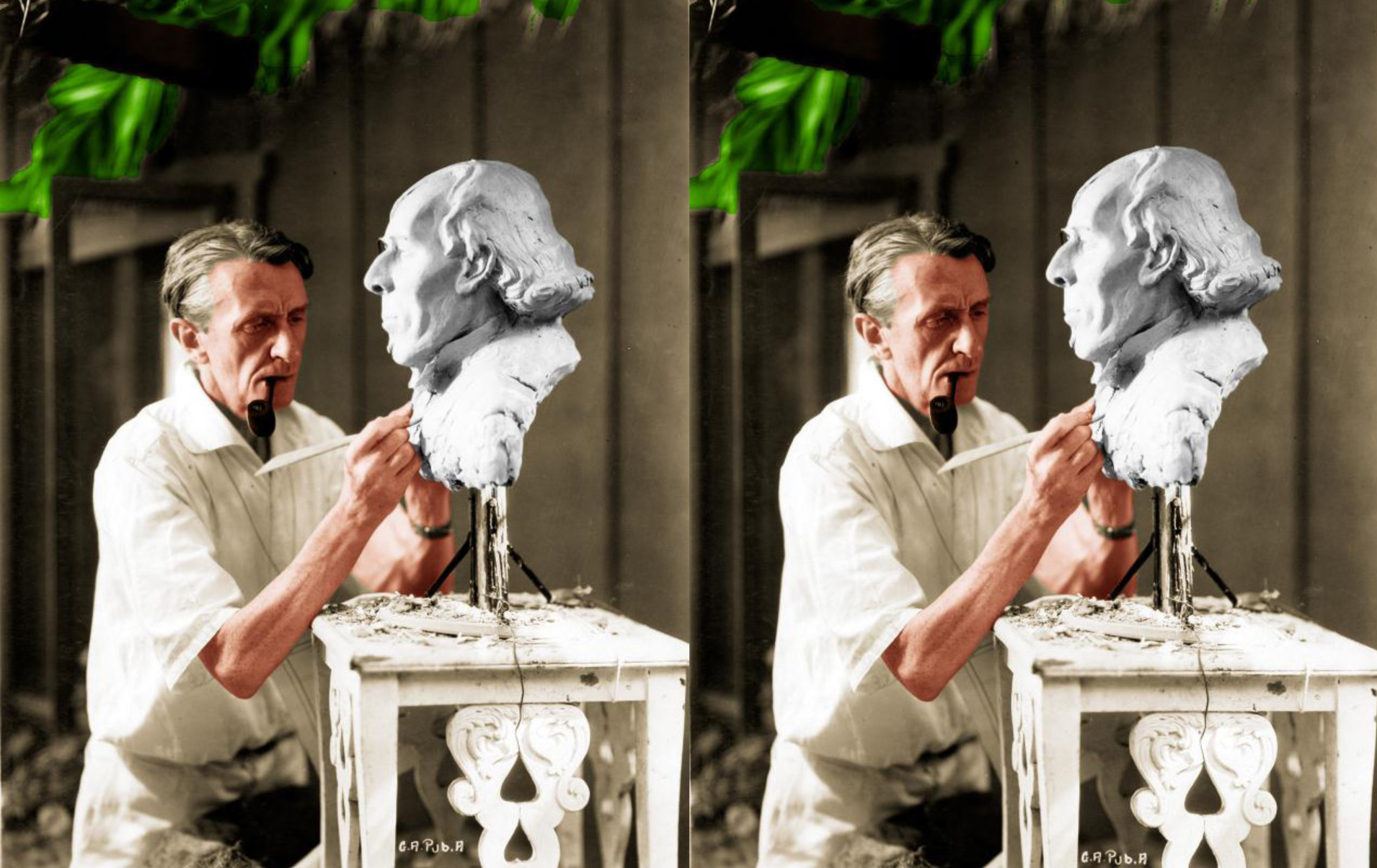 I find that smaller size photos work better than larger ones. Also, experiment with moving the images closer or further away from your eyes. A distance between 10 and 12 inches or so usually works but you’ll just have to use trial and error. Once you’ve experienced the 3D effect you will know what to look for and subsequent free viewing will be easy. Here is Ivan Simpson again without his makeup for DISRAELI, but practicing his skill as a sculptor by immortalizing Mr. A as Mr. Disraeli: